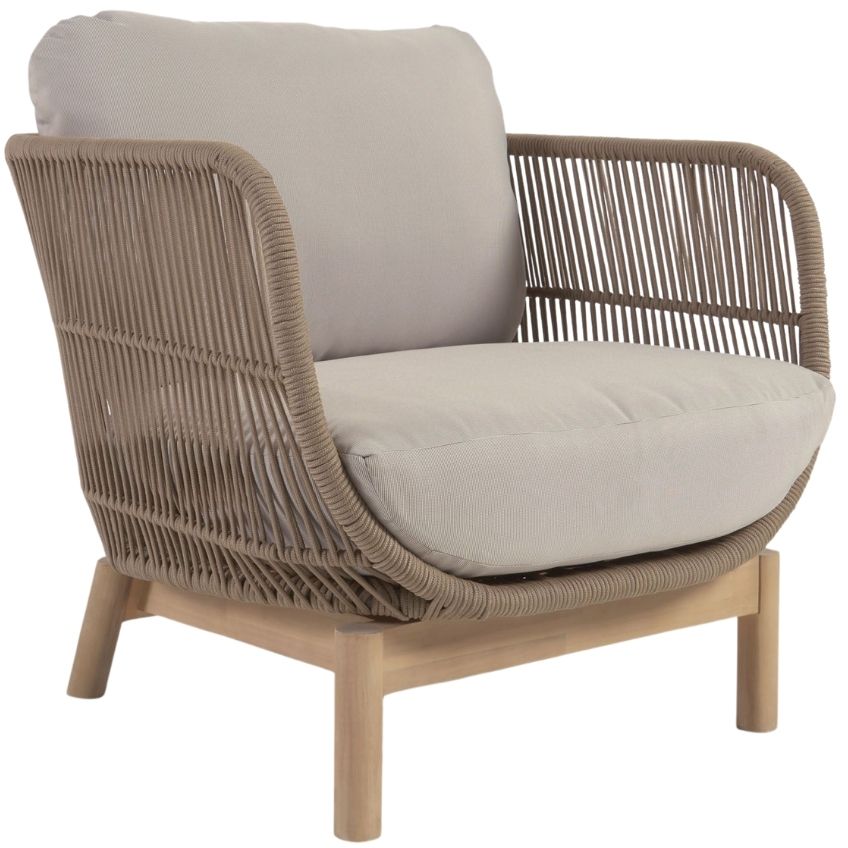 Stylové zahradní křeslo Kave Home Catalina je odolné vůči UV záření, a proto je vhodné nejen pro použití v interiéru – umístit ho můžete také do krytého exteriéru. Skvěle se hodí na terasu nebo na balkon, kde si s ním užijete chvíle odpočinku v maximálním pohodlí. Doplnit ho můžete pohovkou nebo lenoškou ze stejnojmenné série. Křeslo stojí na stabilní podnoži z masivního akátového dřeva s certifikátem FSC, které pochází z udržitelných lesů. Konstrukce křesla je tvořena výpletem z polyesterového lana, který je doplněn polštáři se snímatelnými potahy.