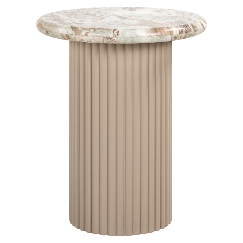 Malý, ale výrazný. Odkládací stolek Coronel vás okouzlí svou kombinací elegance a praktičnosti. Kulatá deska z torontského mramoru s jemným béžovohnědým vzorem bude krásně ladit s neutrálními i teplejšími tóny interiéru. Válcová podnož s vertikálním žebrováním přidá prostoru hloubku a architektonický nádech. Perfektní doplněk vedle pohovky na odložení knížky či šálku čaje nebo jako elegantní noční stolek do ložnice. Snadno se stane nepostradatelnou součástí vašeho domova.