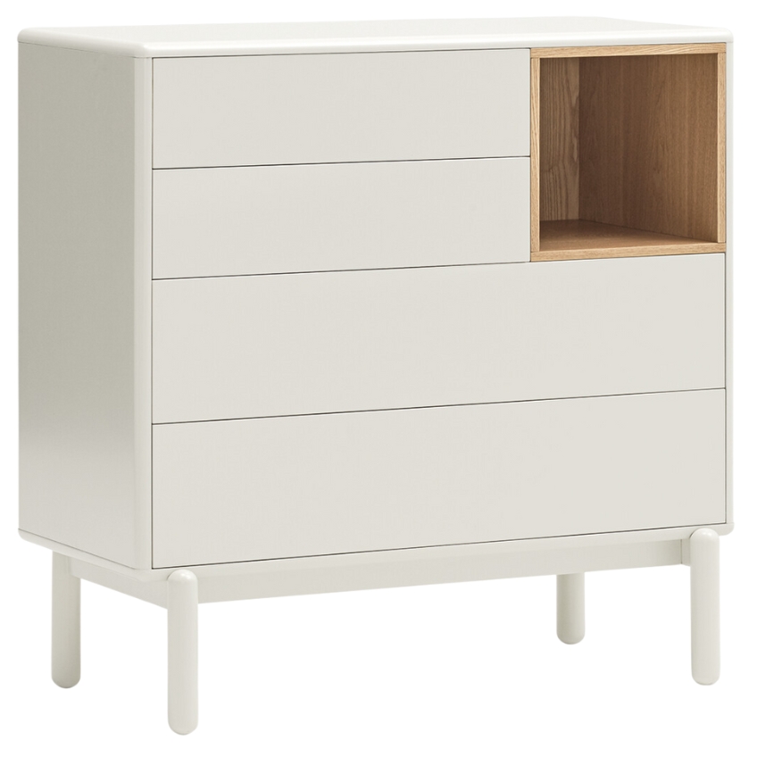 Komoda Teulat Corvo v elegantní krémové barvě vás na první pohled zaujme svým minimalistickým designem a efektivně řešeným úložným prostorem. Korpus komody je z lakovaného MDF, které si oblíbíte pro snadnou údržbu. Úložný prostor se skládá ze čtyř vysouvacích zásuvek. Monotónní barva komody je zpestřena jednou kontrastní policí s dubovou dýhou. Bytelná podnož je z masivního dřeva.