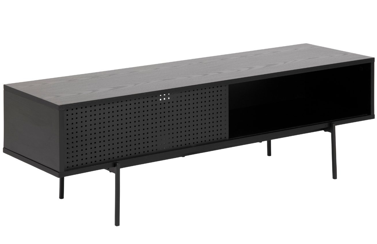 Černý televizní stolek Toren se stane nejen designovým ale i praktickým prvkem vašeho interiéru. Posuvná dvířka s designovým děrováním si můžete prakticky nastavit dle vlastní potřeby a využít tak polici stolku přesně tak, jak vám bude vyhovovat. TV stolek Toren nejlépe doplníte dalším nábytkem ze stejnojmenné série a doladíte tak svůj interiér o designové kousky.