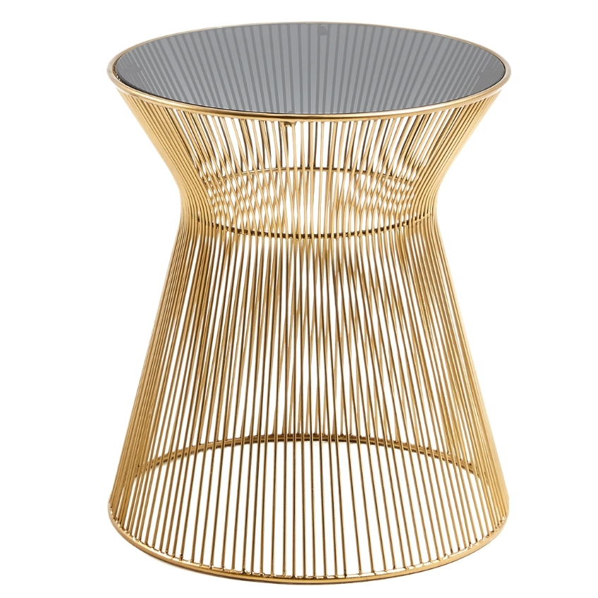 Stylový odkládací stolek Kave Home Jolene je stolek s charakterem. Spojením zlatě lakované kovové podnože a černé skleněné desky vzniká atraktivní kontrast, který s sebou přináší osobitost a unikátní design. Jemné propojení kovových drátků s jednoduchým zakřivením dodává stolku půvab a eleganci. Stolek Jolene skvěle doladí moderní interiéry.